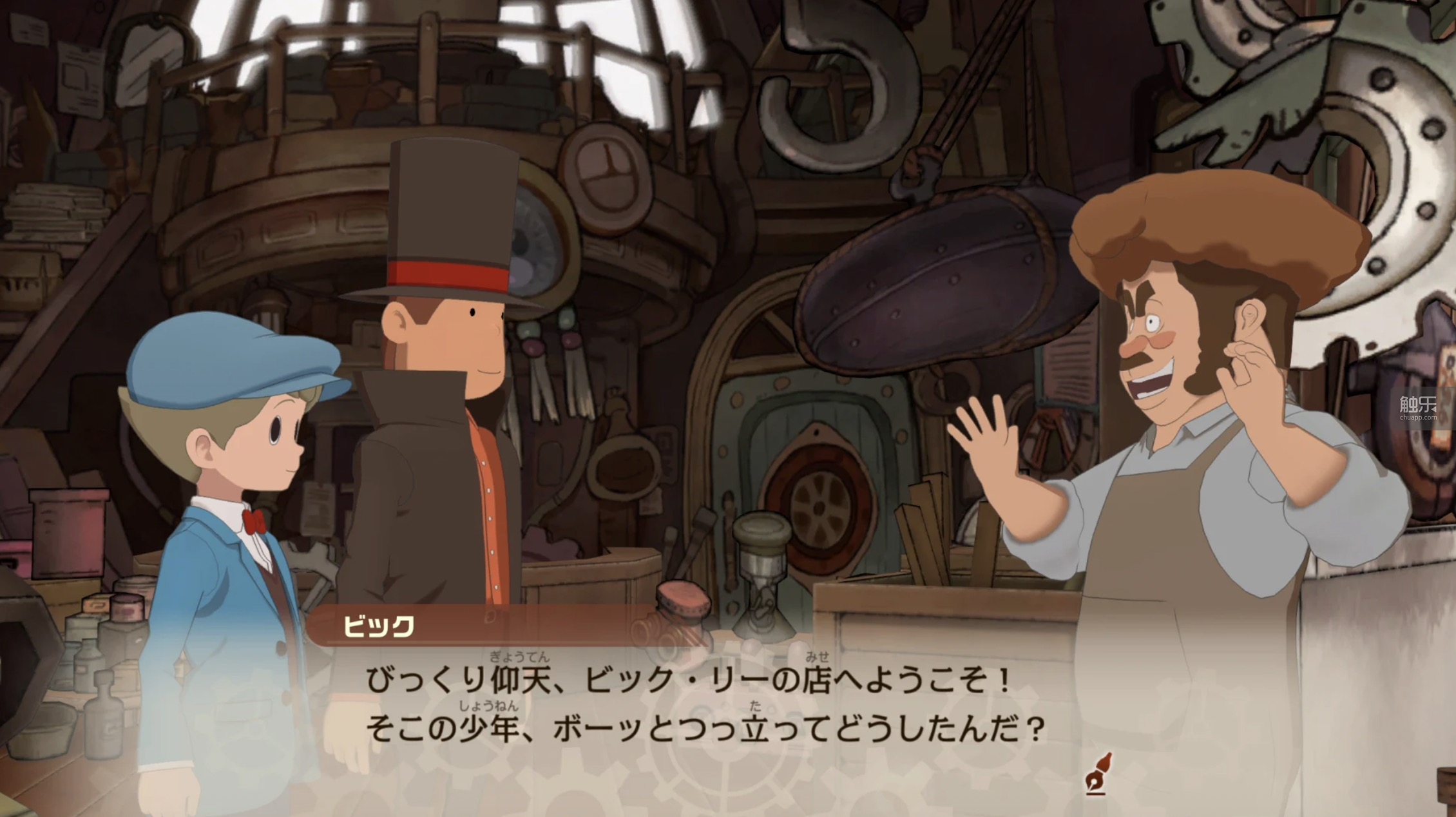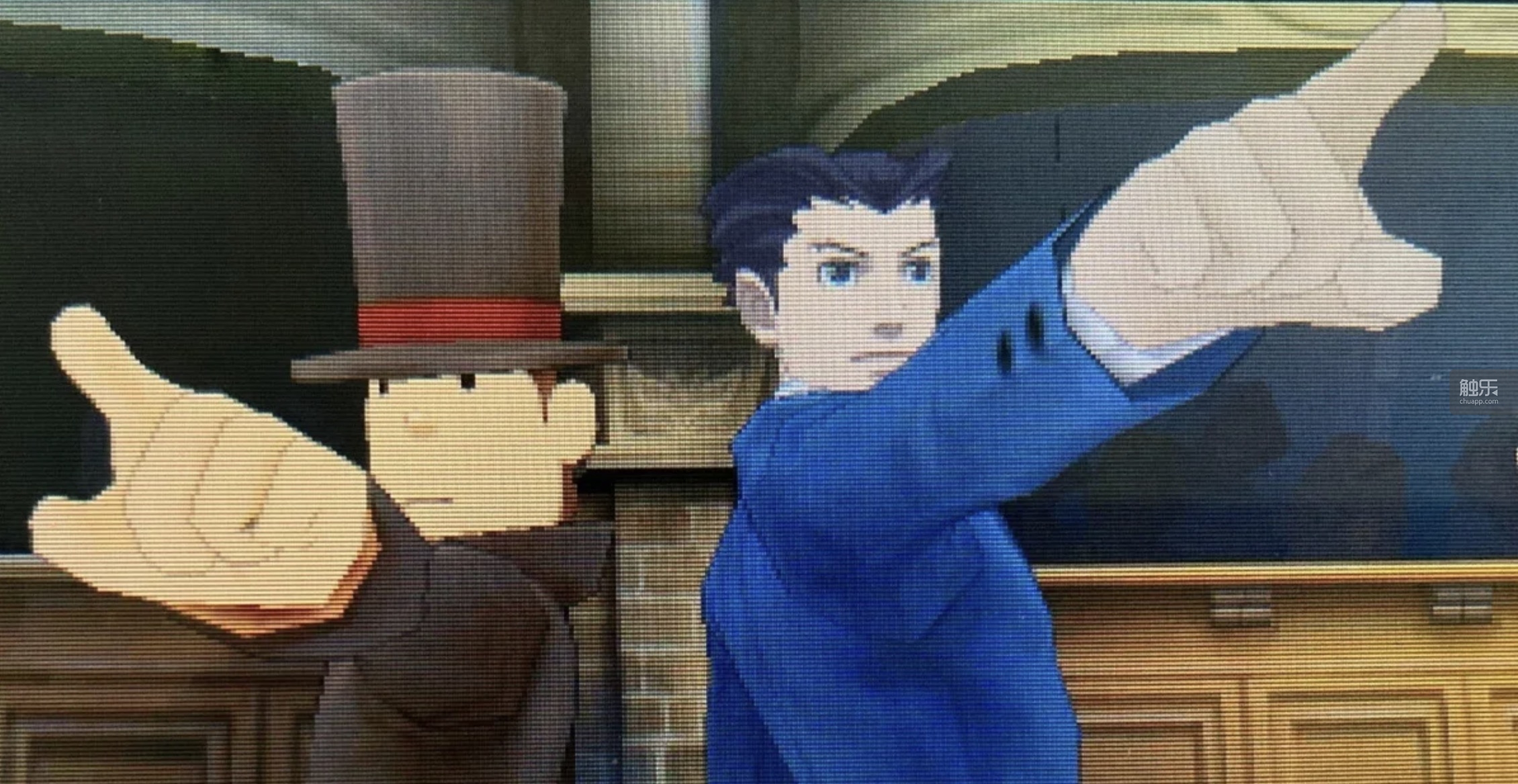 一方面,朋友的介绍听起来确实很诱人;另一方面,我也的确被游戏复古风格的美术,以及那个豆豆眼、穿西装、戴礼帽的主角吸引了。再加上当时已经有民间汉化组推出中文版,还是日语三脚猫的我立刻投入其中,然后就一发不可收拾:除了最早的2部,后续《雷顿教授与最后的时间旅行》《雷顿教授与魔神之笛》《雷顿教授与奇迹的假面》《雷顿教授与超文明A的遗产》,以及《雷顿教授vs逆转裁判》我都玩过。相比之下,我还是更喜欢“前三部曲”,不仅是玩得早,还因为《雷顿教授与最后的时间旅行》带给我的感动实在太深,主题曲非常动听,结局CG更是催人泪下。爱屋及乌,我对前三部曲的整体评价自然也更高些。