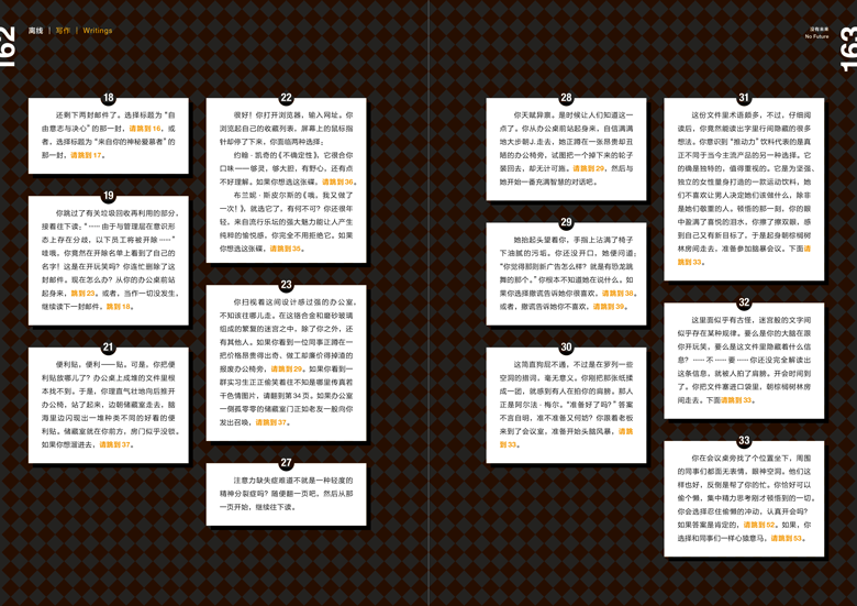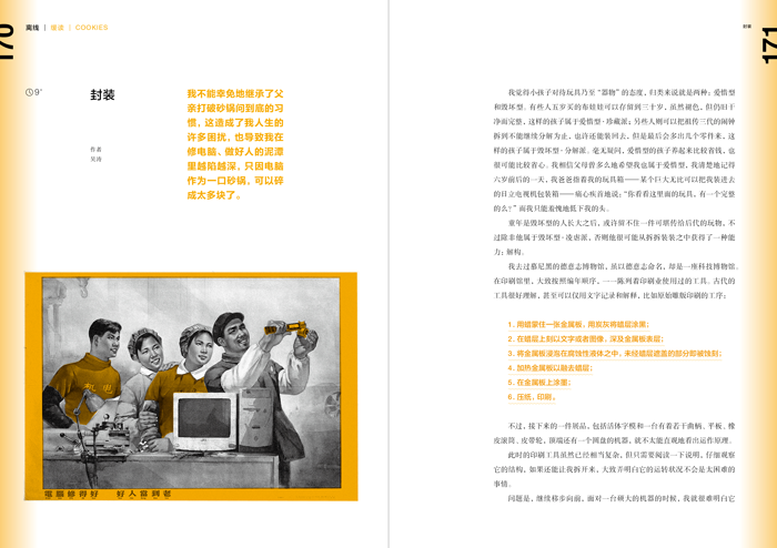 “遗产”追溯了游戏手柄进化发展的历史,“工具”讲述了如何策划一场逃离现代文明的旅行,“写作”则收录了一个有着多种结局的互动故事,“缓读”在最后讨论了机器的封装艺术和睡眠的科学。