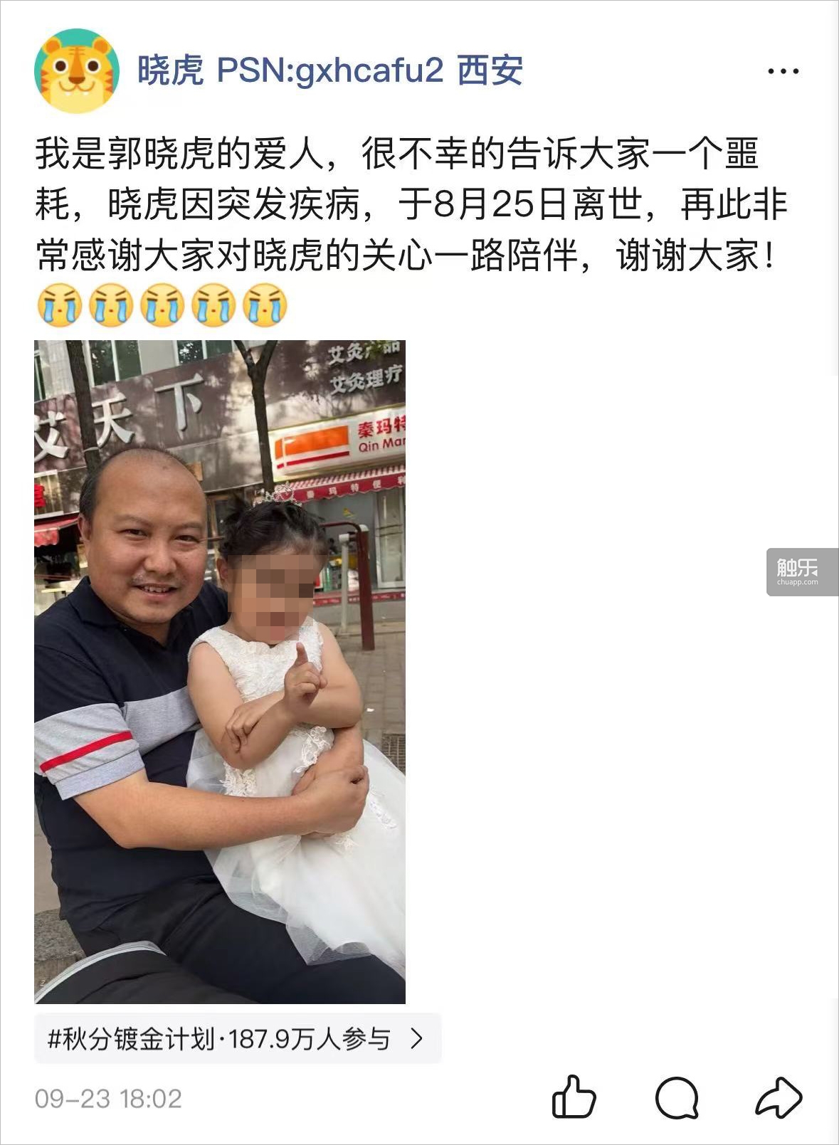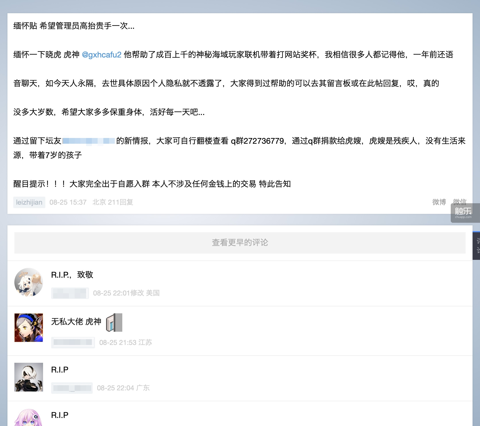 这则缅怀视频和请愿信都在9月10日发出,负责组织的群友告诉我,这是一个在他们看来有意义的日子,“教师节,虎哥现实的职业也是老师”——这是一个疏漏,虎哥现实的职业并不是老师,他们只是听到刘小唯含糊地说了一下他的工作,所以误解了。巧合的是,虎哥确实想过要成为一名老师。