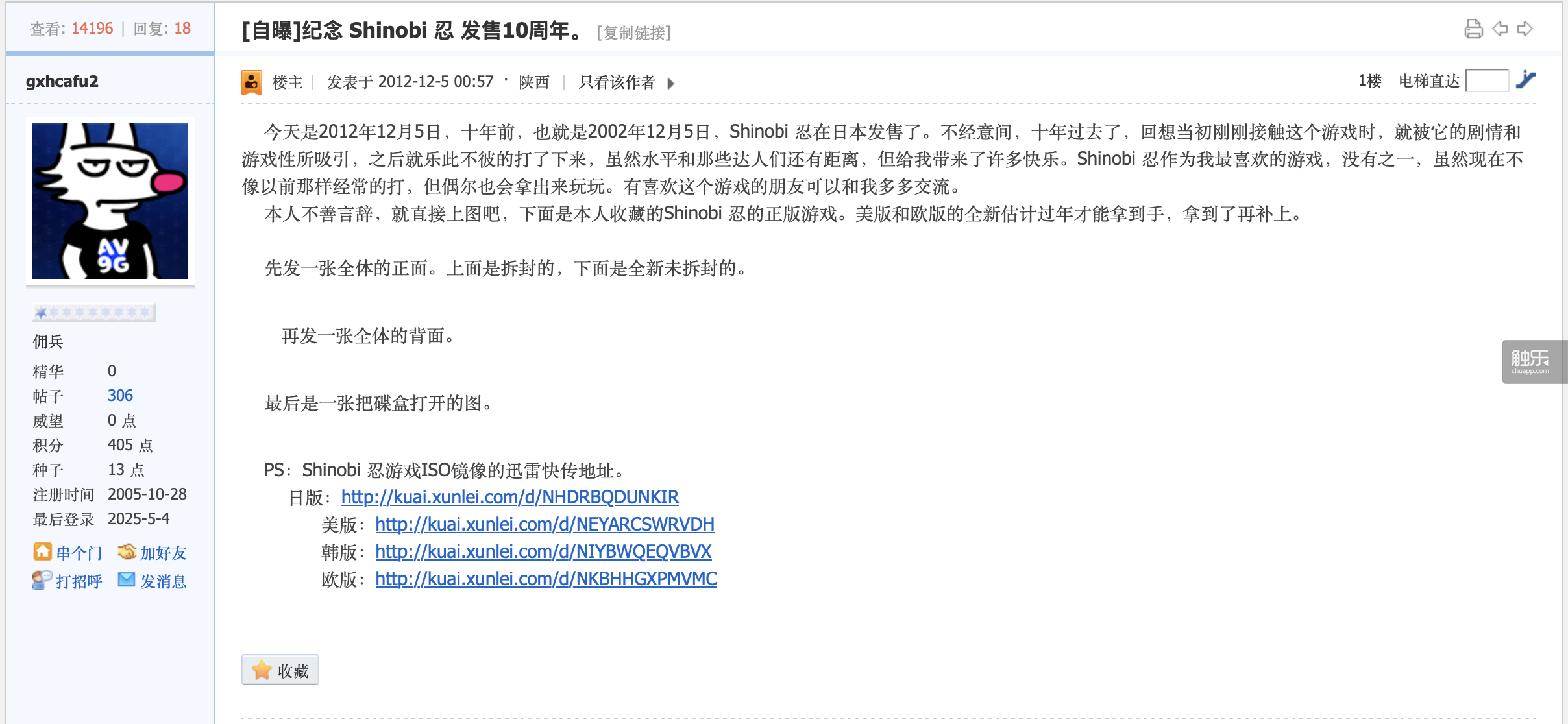 有一些时候,这些形象看起来要更加生动和活泼。2015年之前,虎哥还不到30岁,当时他的分享欲比现在高很多,他在A9VG论坛上发帖,分享自己最喜爱的游戏“忍”系列的相关讯息,回答过不少新手玩家的问题,还展示过自己收集的游戏光盘“全家福”,春节时祝“忍友”节日快乐。到后面,更多时候,他只是随机出现在一些帖子的回复区,闲聊,或者简单地解答问题,虽然那套“忍”系列光盘依然是他的朋友圈背景。