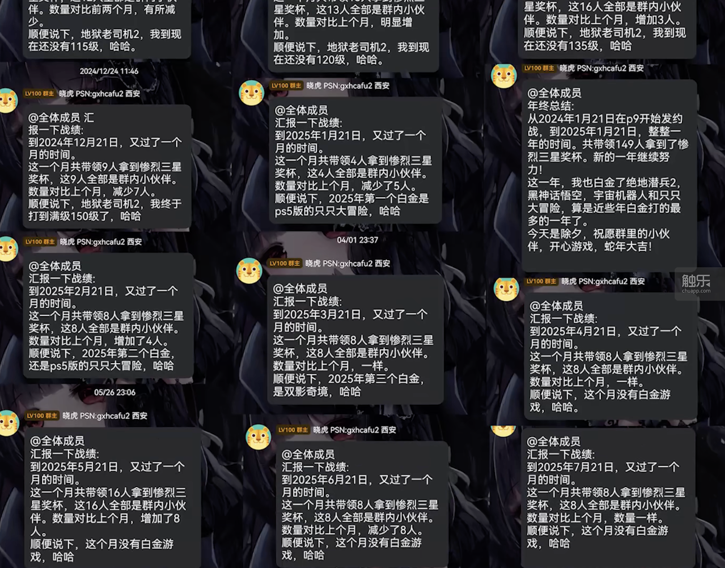 2025年除夕,虎哥在群里发布了一条“年终总结”,里面写道:“从2024年1月21日在P9开始发约战,到2025年1月21日,整整1年的时间,共带领149人拿到了惨烈三星奖杯。新的一年继续努力!这一年,我也白金了《绝地潜兵2》《黑神话:悟空》《宇宙机器人》和《只只大冒险》,算是近些年白金打得最多的一年了。今天是除夕,祝愿群里的小伙伴,开心游戏,蛇年大吉!”